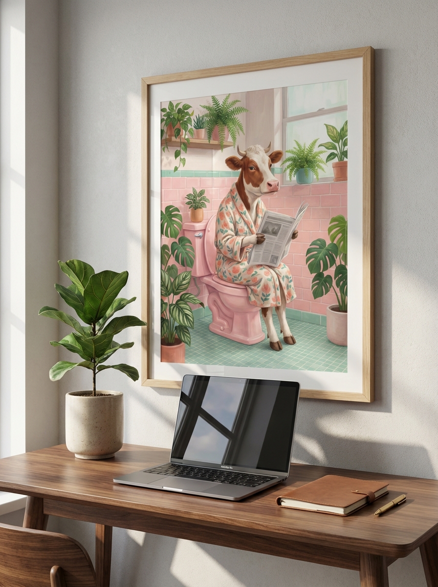 Bu eser hazırlanırken modern baskı teknolojisinin tüm olanaklarından yararlanıldı. Bohem Dokunuş: Tuvalette İnek Sanatı için tasarım ekibi renk profillerini önce dijital ortamda simüle etti; ardından test baskıları alarak gerçek ortamdaki görünümünü doğruladı. Bu titiz süreç, Bohem Dokunuş: Tuvalette İnek Sanatı ürününün ekranda nasıl görünüyorsa baskıda da aynı şekilde görünmesini sağlar. 300 DPI çözünürlük standardı, poster boyutlarında dahi jilet keskinliğinde bir görüntü sunar. Satın alma işleminizin tamamlanmasının ardından dosyalarınızı anında indirebilirsiniz.