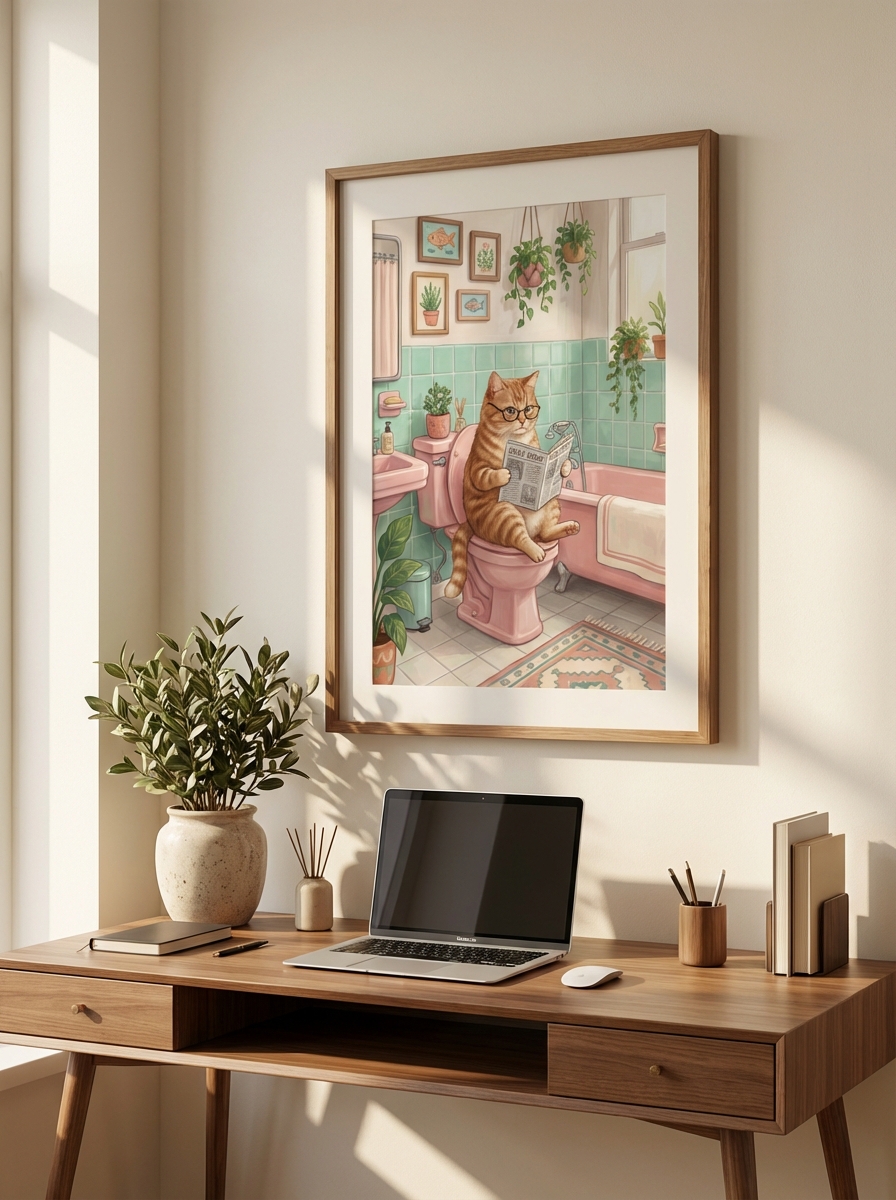 Charming Ginger Cat on Pembe Tuvalet - Unique Wall Dekorasyonu
