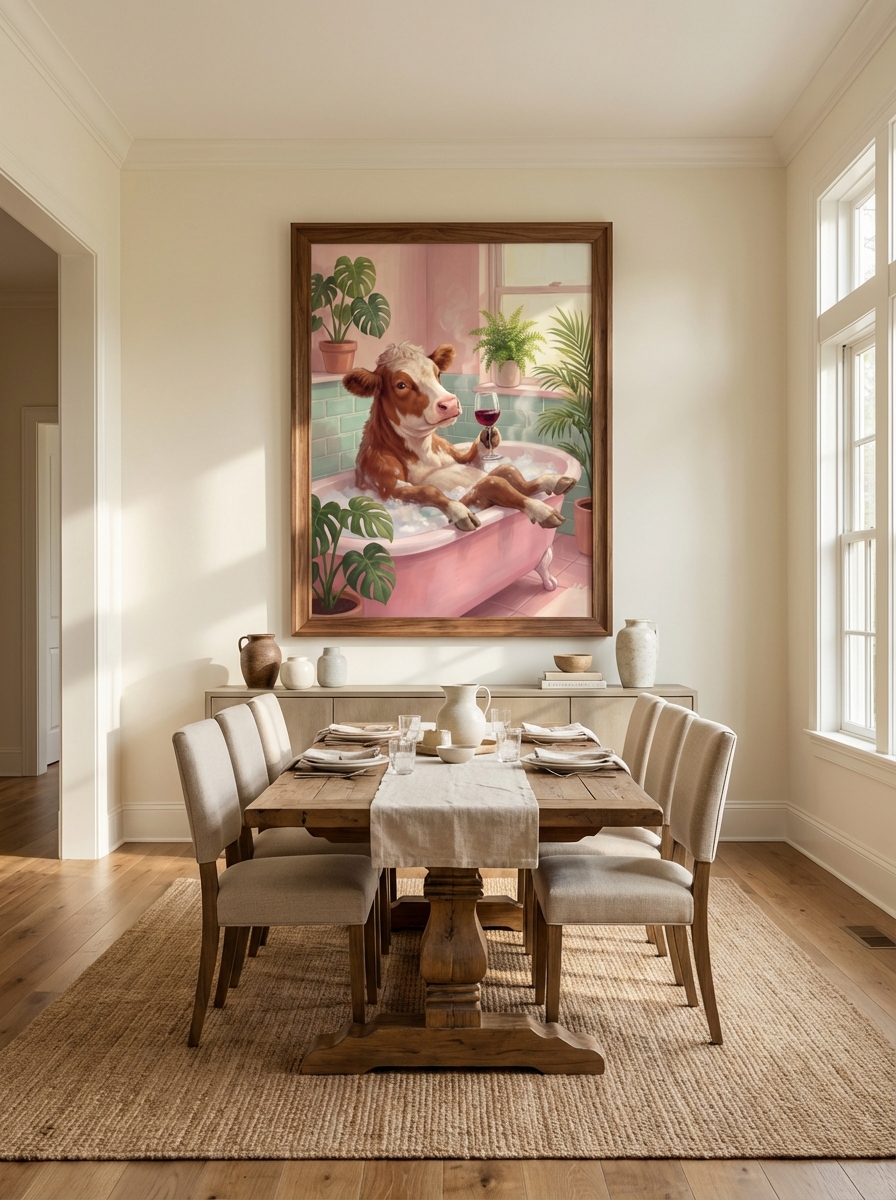 Tasarımı en iyi değerlendirebileceğiniz mekânlar için birkaç öneri sunalım. Cute Cow in Küvet Duvar Sanatı için tuvalet karşısındaki duvar en ideal konumdur; o alanda geçirilen birkaç dakika eseri en uzun süre deneyimleme imkanı sunar. Küvet üstü boşluklar ise banyonun en dramatik görüntü alanıdır ve Cute Cow in Küvet Duvar Sanatı doğru boyutta burada müthiş bir etki yaratır. Çerçeve tercihinizde banyonun mevcut metal aksesuarlarıyla uyum sağlamayı hedefleyin.