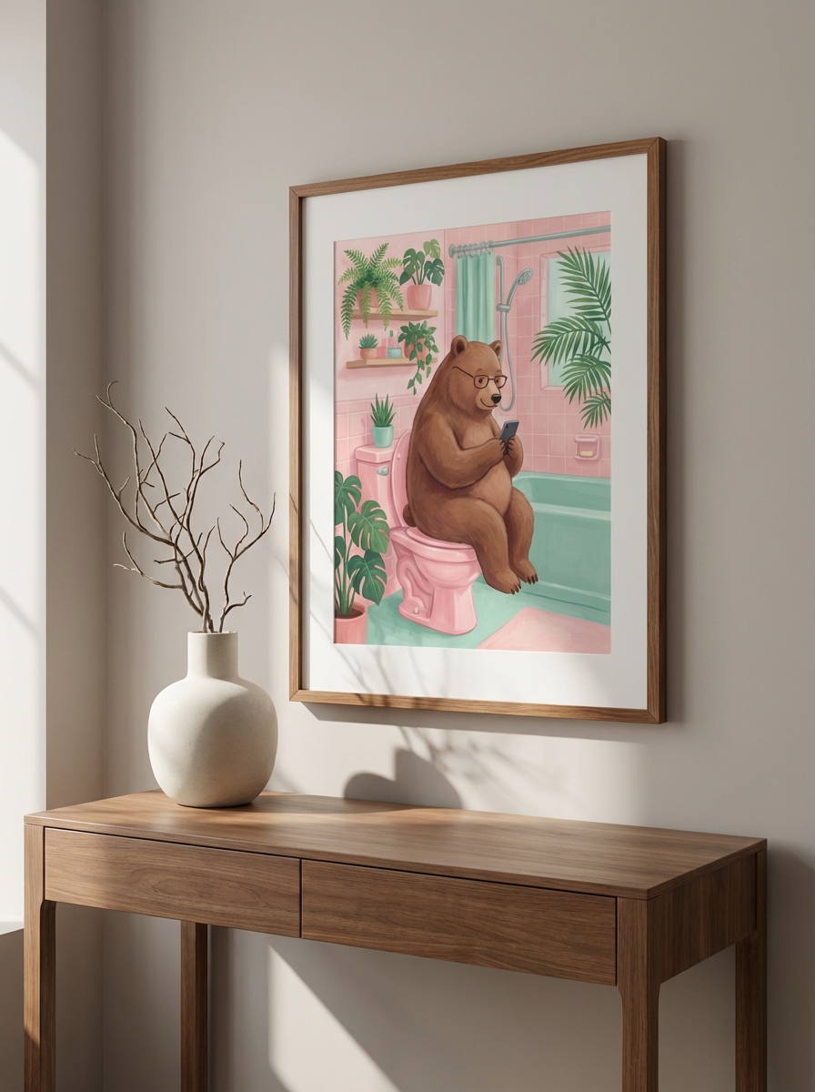 Tasarımı en iyi değerlendirebileceğiniz mekânlar için birkaç öneri sunalım. Eğlenceli Ayı Tuvalette Duvar Halısı için tuvalet karşısındaki duvar en ideal konumdur; o alanda geçirilen birkaç dakika eseri en uzun süre deneyimleme imkanı sunar. Küvet üstü boşluklar ise banyonun en dramatik görüntü alanıdır ve Eğlenceli Ayı Tuvalette Duvar Halısı doğru boyutta burada müthiş bir etki yaratır. Çerçeve tercihinizde banyonun mevcut metal aksesuarlarıyla uyum sağlamayı hedefleyin.