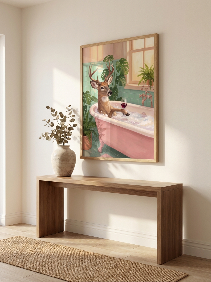 Sanat eserini doğru yerleştirmek onu doğru seçmek kadar önemlidir. Eğlenceli Geyik Küvette Tuval Sanatı doğal ışık alan banyolarda özellikle çarpıcı görünür. Pencereden düşen ışık renklerin canlılığını artırır ve Eğlenceli Geyik Küvette Tuval Sanatı eserine üç boyutlu bir derinlik hissi katar. Banyonuzda doğal ışık yoksa renk sıcaklığı 3000-4000K arasında bir LED aydınlatma tercih edin; bu baskı renklerine en doğal görünümü sunar.
