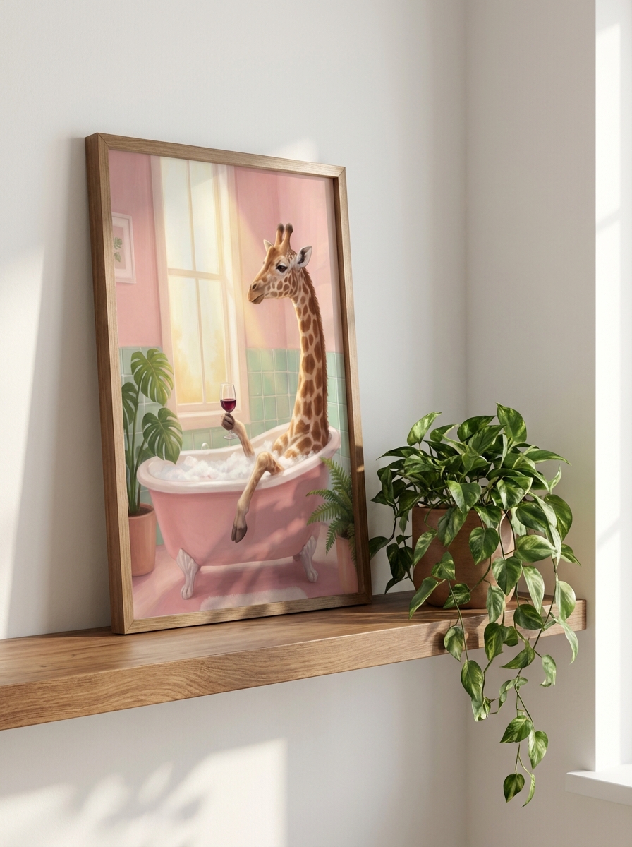 Banyo dekorasyonunda en sık yapılan hata tarzın tutarsızlığıdır. Giraffe in Küvet Nursery Duvar Sanatı bu sorunu kökten çözüyor; minimalist, Skandinav ve modern Bohem tarzlarla mükemmel uyum sağlıyor. Siyah metal çerçeve seçerseniz Giraffe in Küvet Nursery Duvar Sanatı mekana çağdaş bir karakter kazandırır; doğal ahşap çerçeve ise sıcak ve organik bir hava yaratır. Küçük banyolarda tek büyük eser çok daha güçlü bir etki bırakırken büyük banyolarda birkaç küçük eseri simetrik olarak dizmek galeri görünümü sunar.