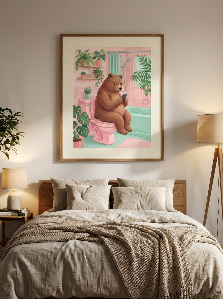 Sanat eserini doğru yerleştirmek onu doğru seçmek kadar önemlidir. Komik Ayı ile Tuvalet Eğlencesi doğal ışık alan banyolarda özellikle çarpıcı görünür. Pencereden düşen ışık renklerin canlılığını artırır ve Komik Ayı ile Tuvalet Eğlencesi eserine üç boyutlu bir derinlik hissi katar. Banyonuzda doğal ışık yoksa renk sıcaklığı 3000-4000K arasında bir LED aydınlatma tercih edin; bu baskı renklerine en doğal görünümü sunar.