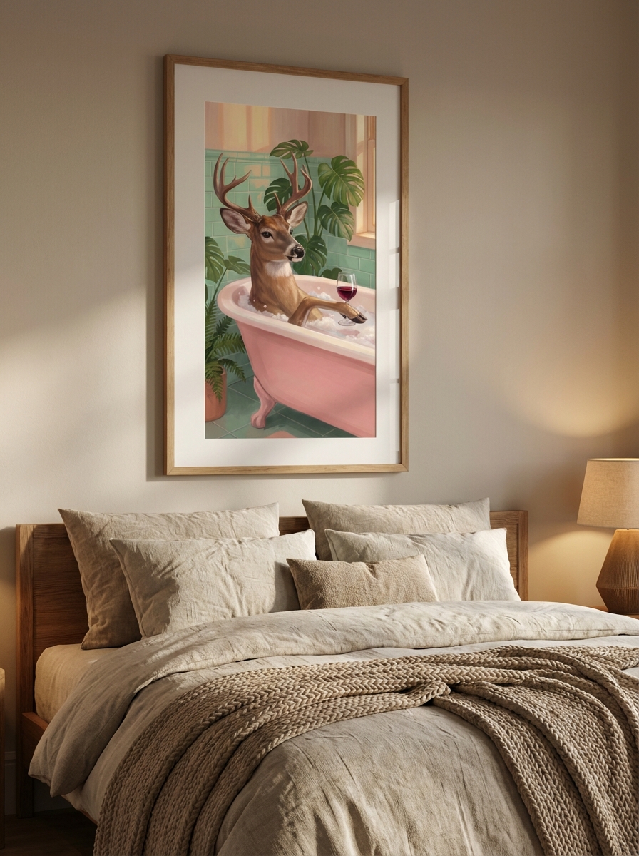 Tasarımı en iyi değerlendirebileceğiniz mekânlar için birkaç öneri sunalım. Modern Geyik Banyosu Duvar Sanatı Tasarımı için tuvalet karşısındaki duvar en ideal konumdur; o alanda geçirilen birkaç dakika eseri en uzun süre deneyimleme imkanı sunar. Küvet üstü boşluklar ise banyonun en dramatik görüntü alanıdır ve Modern Geyik Banyosu Duvar Sanatı Tasarımı doğru boyutta burada müthiş bir etki yaratır. Çerçeve tercihinizde banyonun mevcut metal aksesuarlarıyla uyum sağlamayı hedefleyin.