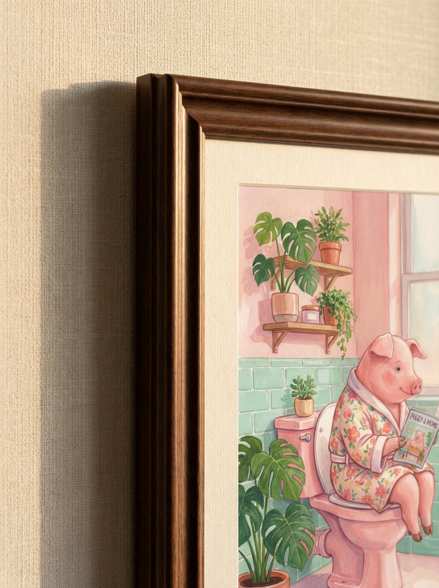 Banyo dekorasyonunda en sık yapılan hata tarzın tutarsızlığıdır. Özel Tasarım Pembe Domuz - Sevimlilerin Sevimlisi bu sorunu kökten çözüyor; minimalist, Skandinav ve modern Bohem tarzlarla mükemmel uyum sağlıyor. Siyah metal çerçeve seçerseniz Özel Tasarım Pembe Domuz - Sevimlilerin Sevimlisi mekana çağdaş bir karakter kazandırır; doğal ahşap çerçeve ise sıcak ve organik bir hava yaratır. Küçük banyolarda tek büyük eser çok daha güçlü bir etki bırakırken büyük banyolarda birkaç küçük eseri simetrik olarak dizmek galeri görünümü sunar.