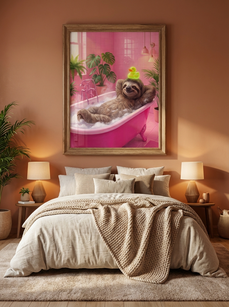 Pembe Küvet İçinde Tembel Ayı: Eğlenceli Duvar Tablosu