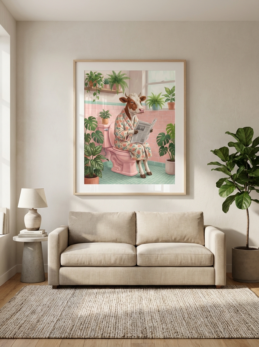 Tasarımı en iyi değerlendirebileceğiniz mekânlar için birkaç öneri sunalım. Sevimli İnek ve Tuval Sanatı için tuvalet karşısındaki duvar en ideal konumdur; o alanda geçirilen birkaç dakika eseri en uzun süre deneyimleme imkanı sunar. Küvet üstü boşluklar ise banyonun en dramatik görüntü alanıdır ve Sevimli İnek ve Tuval Sanatı doğru boyutta burada müthiş bir etki yaratır. Çerçeve tercihinizde banyonun mevcut metal aksesuarlarıyla uyum sağlamayı hedefleyin.