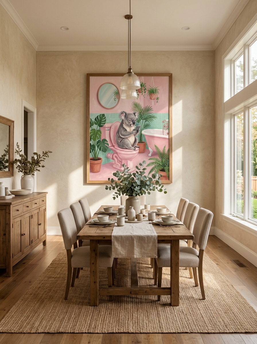 Tasarımı en iyi değerlendirebileceğiniz mekânlar için birkaç öneri sunalım. Sevimli Koala Pembe Tuvalet - Mükemmel Hediye için tuvalet karşısındaki duvar en ideal konumdur; o alanda geçirilen birkaç dakika eseri en uzun süre deneyimleme imkanı sunar. Küvet üstü boşluklar ise banyonun en dramatik görüntü alanıdır ve Sevimli Koala Pembe Tuvalet - Mükemmel Hediye doğru boyutta burada müthiş bir etki yaratır. Çerçeve tercihinizde banyonun mevcut metal aksesuarlarıyla uyum sağlamayı hedefleyin.