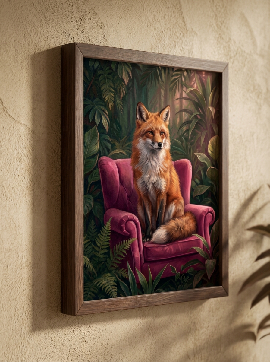 Bu eseri hangi alanda kullanacağınız kadar nasıl sergilediğiniz de önemlidir. Sevimli Pembe Koltuk ve Tilki Duvar Resmi için asma yüksekliği göz hizasının biraz altında tutulduğunda tasarımın etkisi maksimuma ulaşır. Altın ya da pirinç çerçeve eklektik bir görünüm verirken siyah çerçeve modern sadeliği vurgular. Sevimli Pembe Koltuk ve Tilki Duvar Resmi açık renkli fayans ve nötr duvar boyasıyla mükemmel kontrast oluşturur. Büyük banyolarda ikili ya da üçlü galeri duvarı oluşturabilirsiniz.