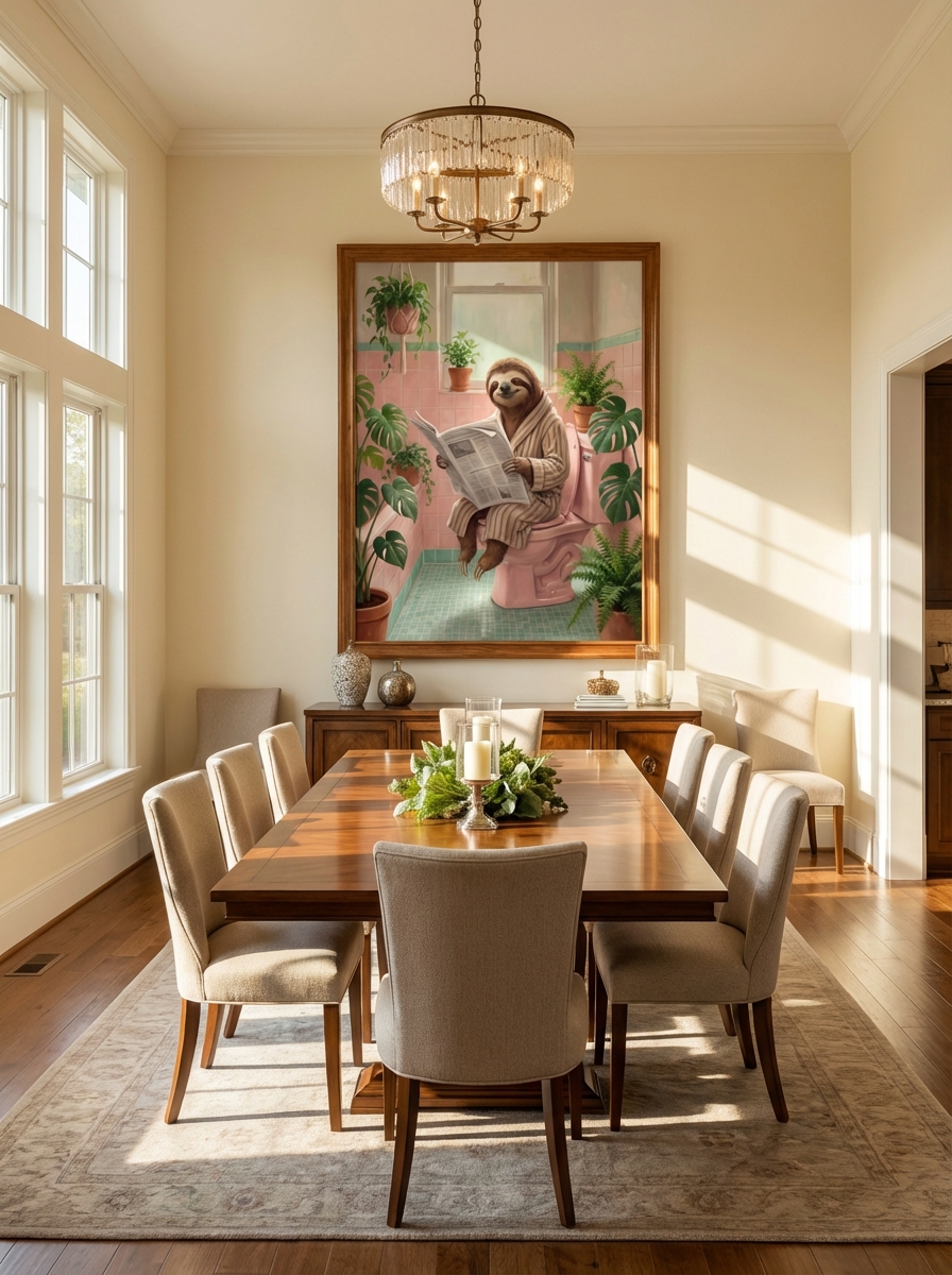 Banyo dekorasyonunda en sık yapılan hata tarzın tutarsızlığıdır. Sevimli Tembel Hayvanların Pembe Duvar Sanatı bu sorunu kökten çözüyor; minimalist, Skandinav ve modern Bohem tarzlarla mükemmel uyum sağlıyor. Siyah metal çerçeve seçerseniz Sevimli Tembel Hayvanların Pembe Duvar Sanatı mekana çağdaş bir karakter kazandırır; doğal ahşap çerçeve ise sıcak ve organik bir hava yaratır. Küçük banyolarda tek büyük eser çok daha güçlü bir etki bırakırken büyük banyolarda birkaç küçük eseri simetrik olarak dizmek galeri görünümü sunar.