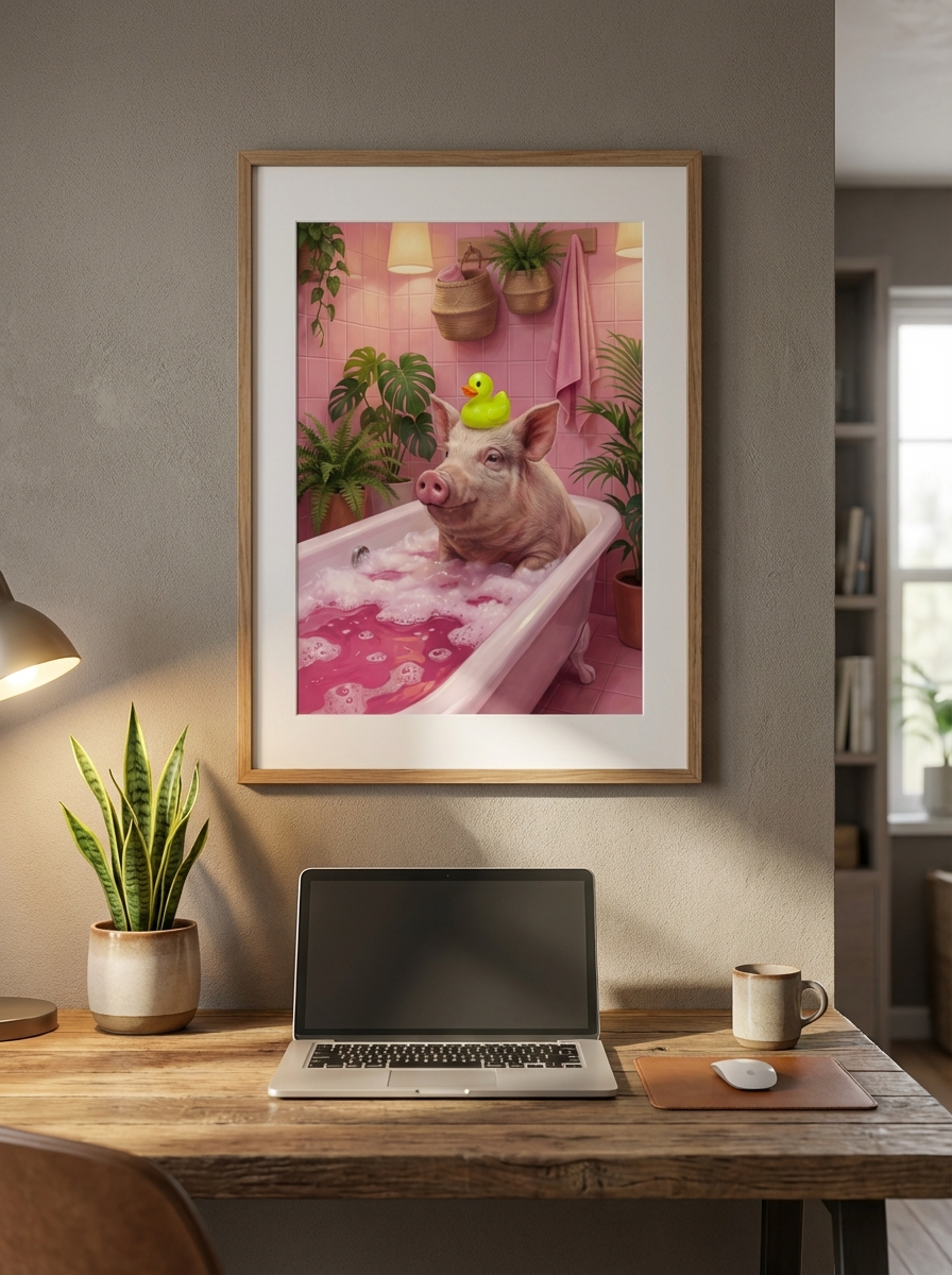 Benzersiz bir estetik anlayışın ürünü olarak PembeDuvar koleksiyonunda hak ettiği yeri aldı. Şirin Pig in Küvet Duvar Tablosu tasarımının arka planında uzun bir araştırma süreci yatmaktadır. Renk uyumları, baskı teknolojisinin sınırları ve hedef mekanın atmosferi göz önünde bulundurularak her detay özenle yerleştirildi. Dosyalar 300 DPI baskı standardında hazırlandı; A0 boyutuna kadar keskin ve detaylı baskı almanızı garanti eder. Satın aldıktan hemen sonra Şirin Pig in Küvet Duvar Tablosu dijital dosyalarınızı indirip 81 ildeki baskı merkezlerinde işleme sokabilirsiniz. Kanvas tablo, fotoğraf kağıdı, cam baskı veya kuşe poster gibi farklı materyal seçenekleri arasından banyonuzun havasına en uygun olanı tercih edebilirsiniz.