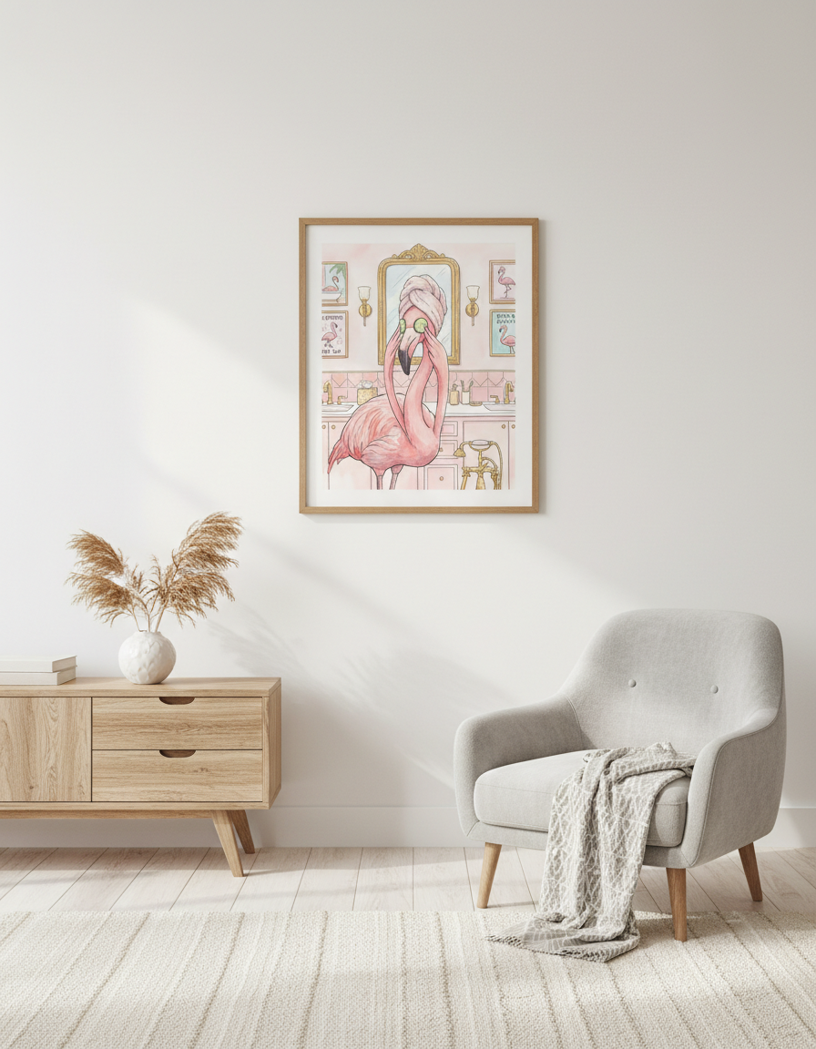 Bu eseri hangi alanda kullanacağınız kadar nasıl sergilediğiniz de önemlidir. SPA Flamingo Spa Tuzu için asma yüksekliği göz hizasının biraz altında tutulduğunda tasarımın etkisi maksimuma ulaşır. Altın ya da pirinç çerçeve eklektik bir görünüm verirken siyah çerçeve modern sadeliği vurgular. SPA Flamingo Spa Tuzu açık renkli fayans ve nötr duvar boyasıyla mükemmel kontrast oluşturur. Büyük banyolarda ikili ya da üçlü galeri duvarı oluşturabilirsiniz.