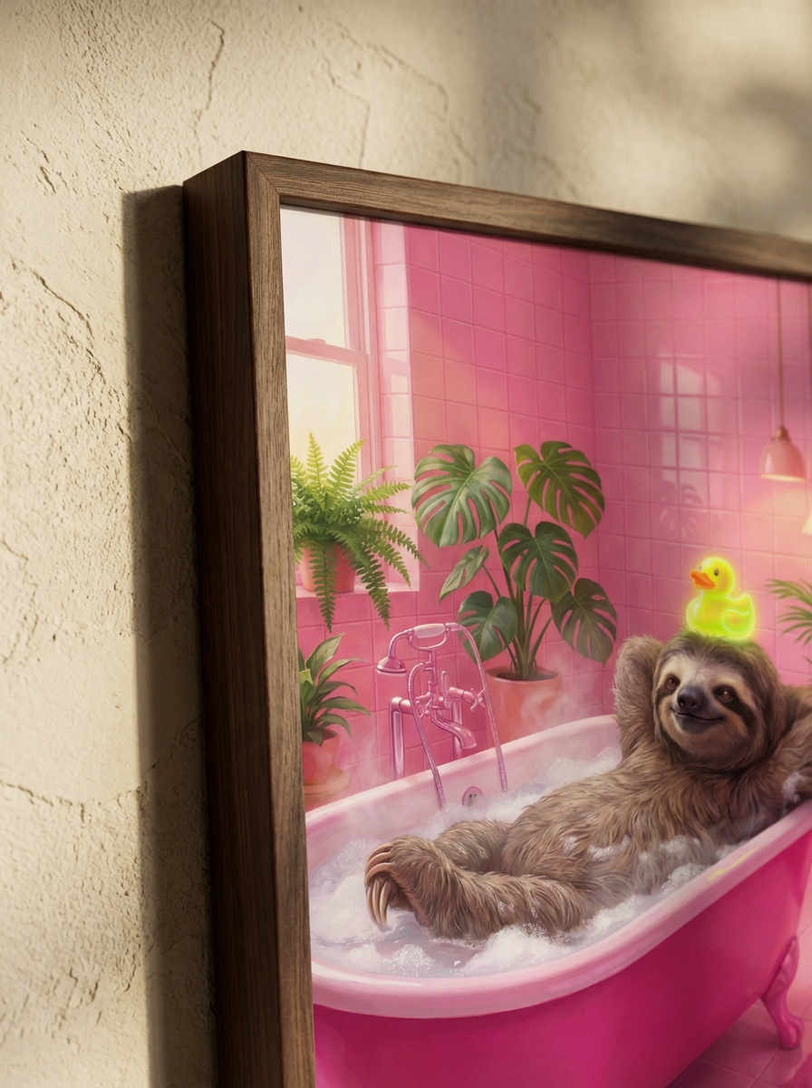 Tasarımı en iyi değerlendirebileceğiniz mekânlar için birkaç öneri sunalım. Tembel Hayvan İle Mutluluk Yayan Duvar Sanatı için tuvalet karşısındaki duvar en ideal konumdur; o alanda geçirilen birkaç dakika eseri en uzun süre deneyimleme imkanı sunar. Küvet üstü boşluklar ise banyonun en dramatik görüntü alanıdır ve Tembel Hayvan İle Mutluluk Yayan Duvar Sanatı doğru boyutta burada müthiş bir etki yaratır. Çerçeve tercihinizde banyonun mevcut metal aksesuarlarıyla uyum sağlamayı hedefleyin.